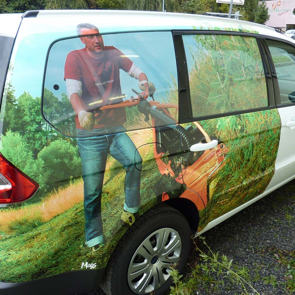 Ist eine bedruckte, perforierte Folie mit schwarzer Rückseite für den Einsatz auf transparenten Flächen z.B. Schaufenster. Auf der Frontseite ist das Druckbild sichtbar, die schwarze Rückseite ist aufgrund der Perforation blickdurchlässig.