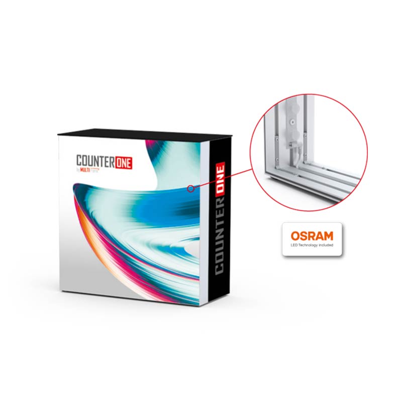 Multi frame counter one ist ein mobiles Thekensystem mit hinterleuchteten Bildfläche (100x100cm) an der Vorderseite und einem praktischen Ablagefach im inneren des Systems.