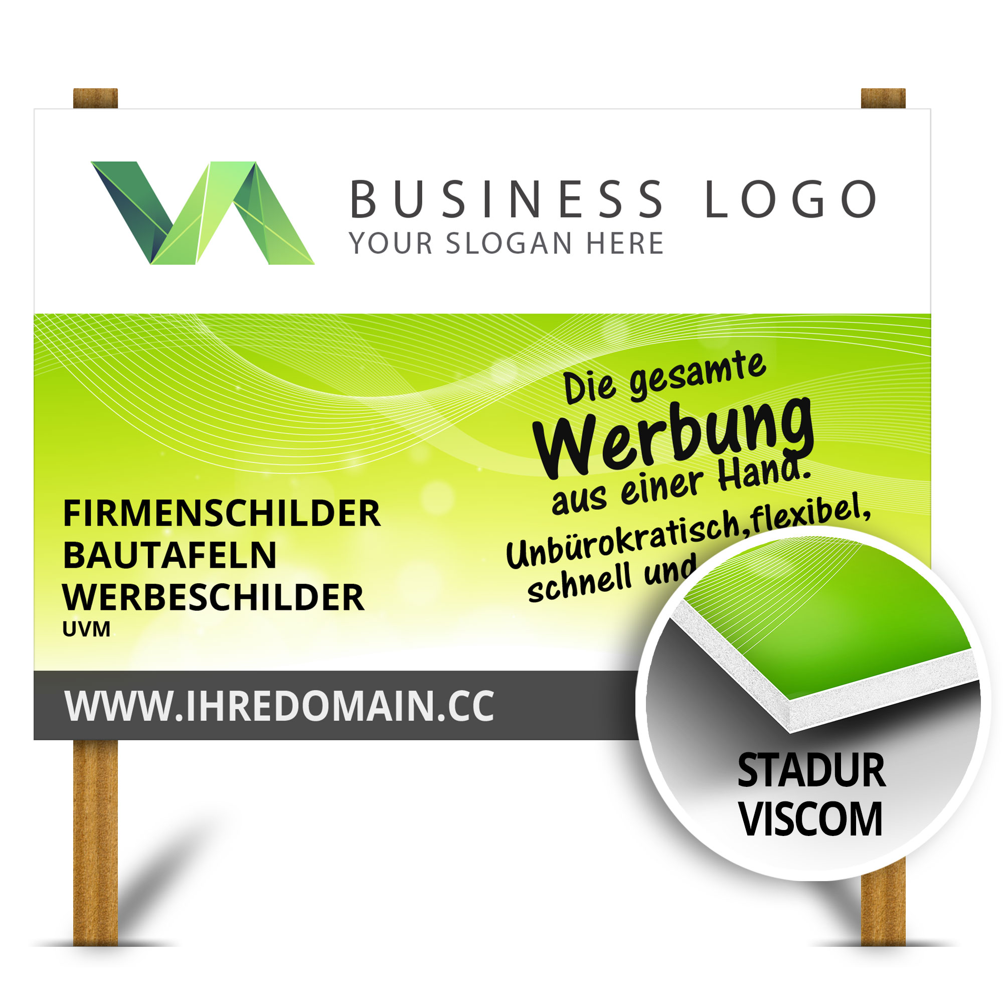 Direkt bedrucktes Stadur Viscom-Werbeschild, optional auch mit beidseitigen Druck.
